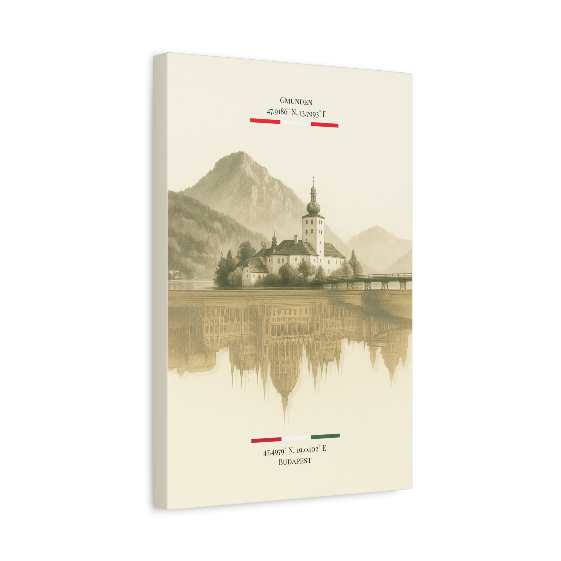 This fine-art illustration from our Weltenwanderer Collection captures the emotional path between Gmunden and Budapest — two cities shaped by water, history, and completely different rhythms of life. One calm and Alpine, the other vibrant and crowned by the Danube’s eternal flow.