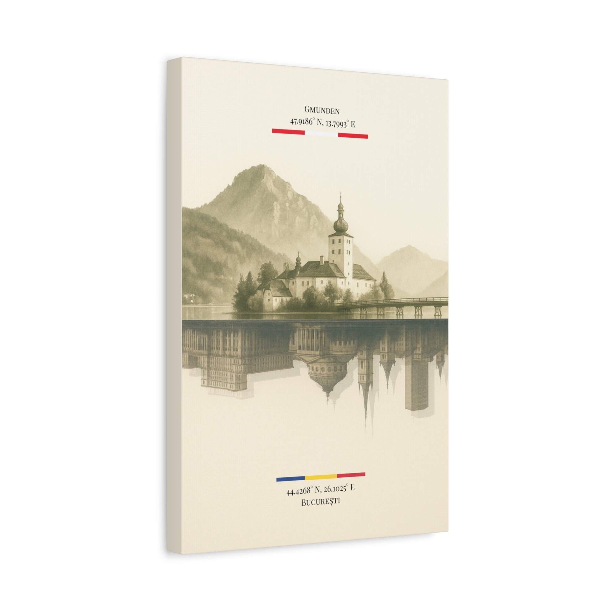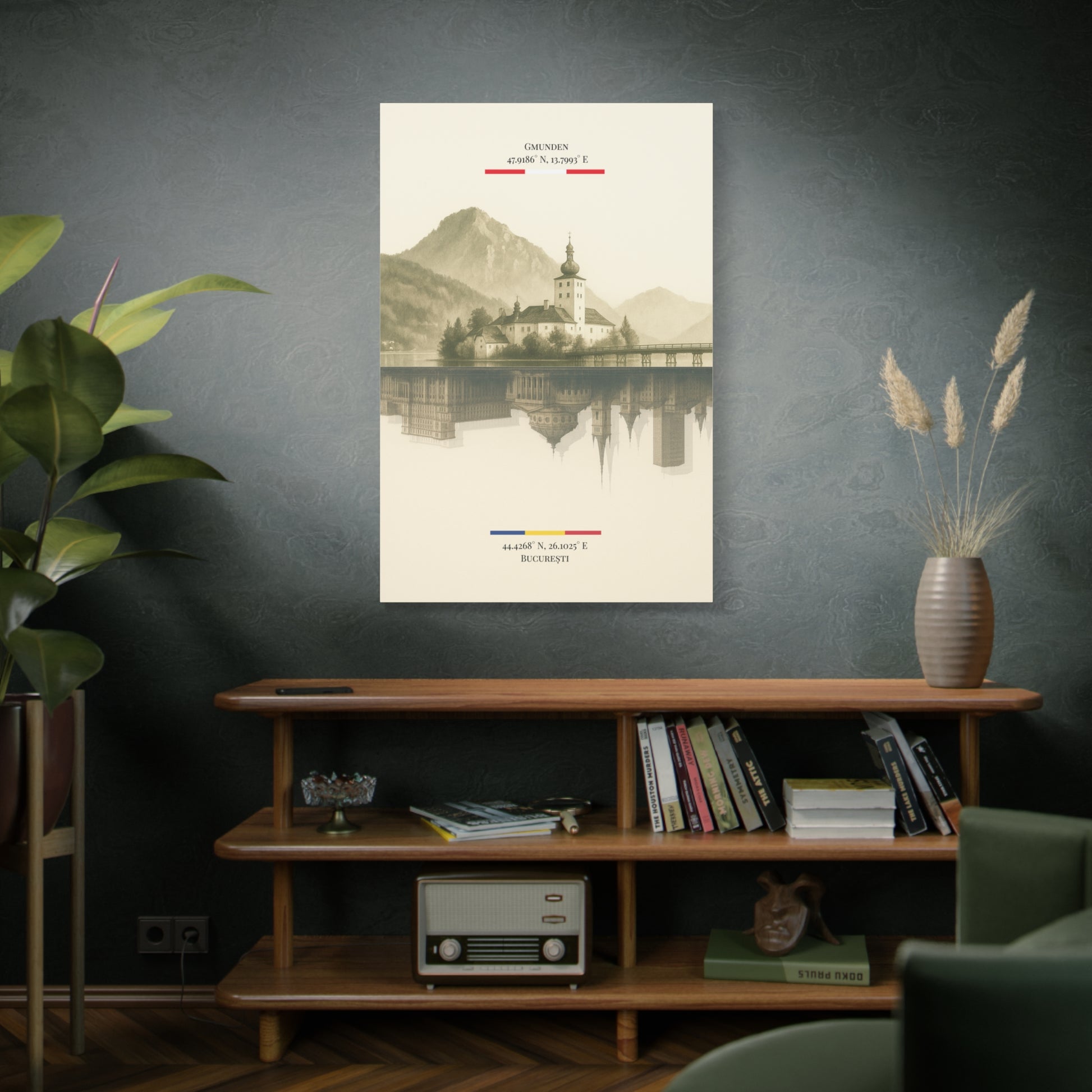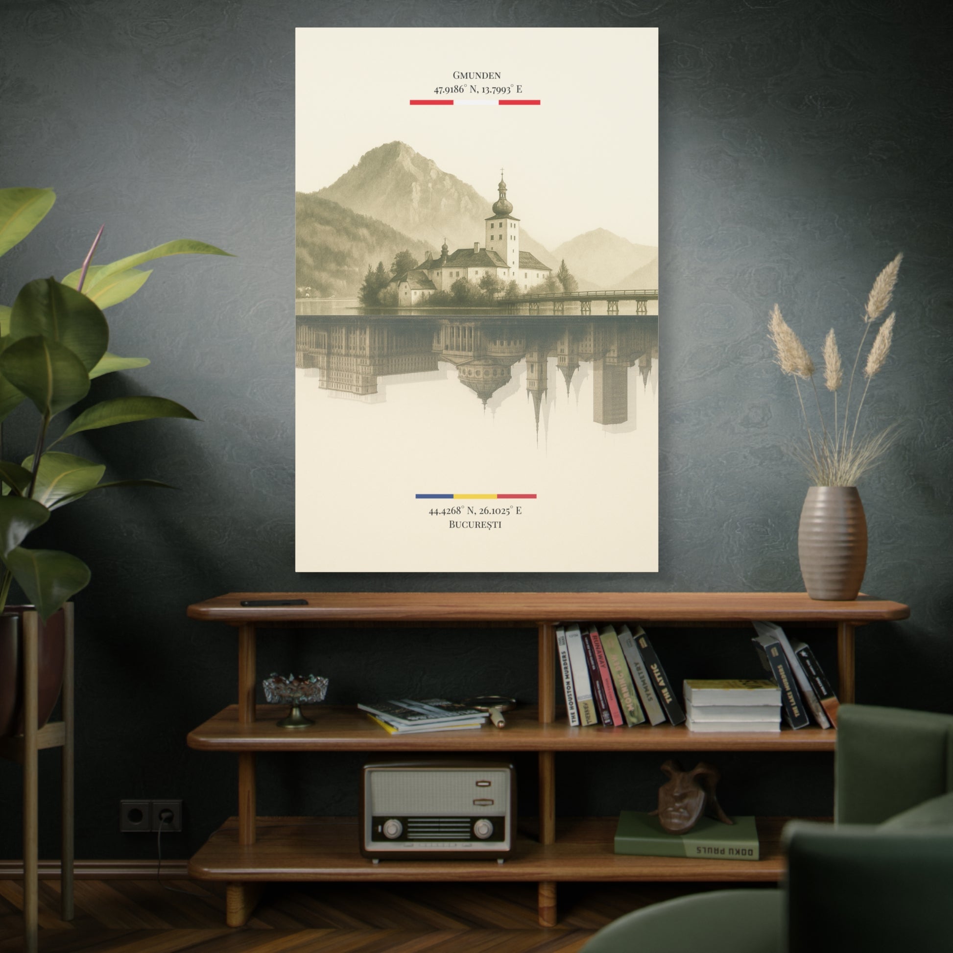 This fine-art illustration from our Heimatstadt Collection captures the connection between Gmunden and Bucharest (București) — two cities that shape identity in very different ways. One calm and Alpine, nestled between lakes and mountains. The other dynamic, historic, and marked by the unmistakable rhythm of Romania’s capital.