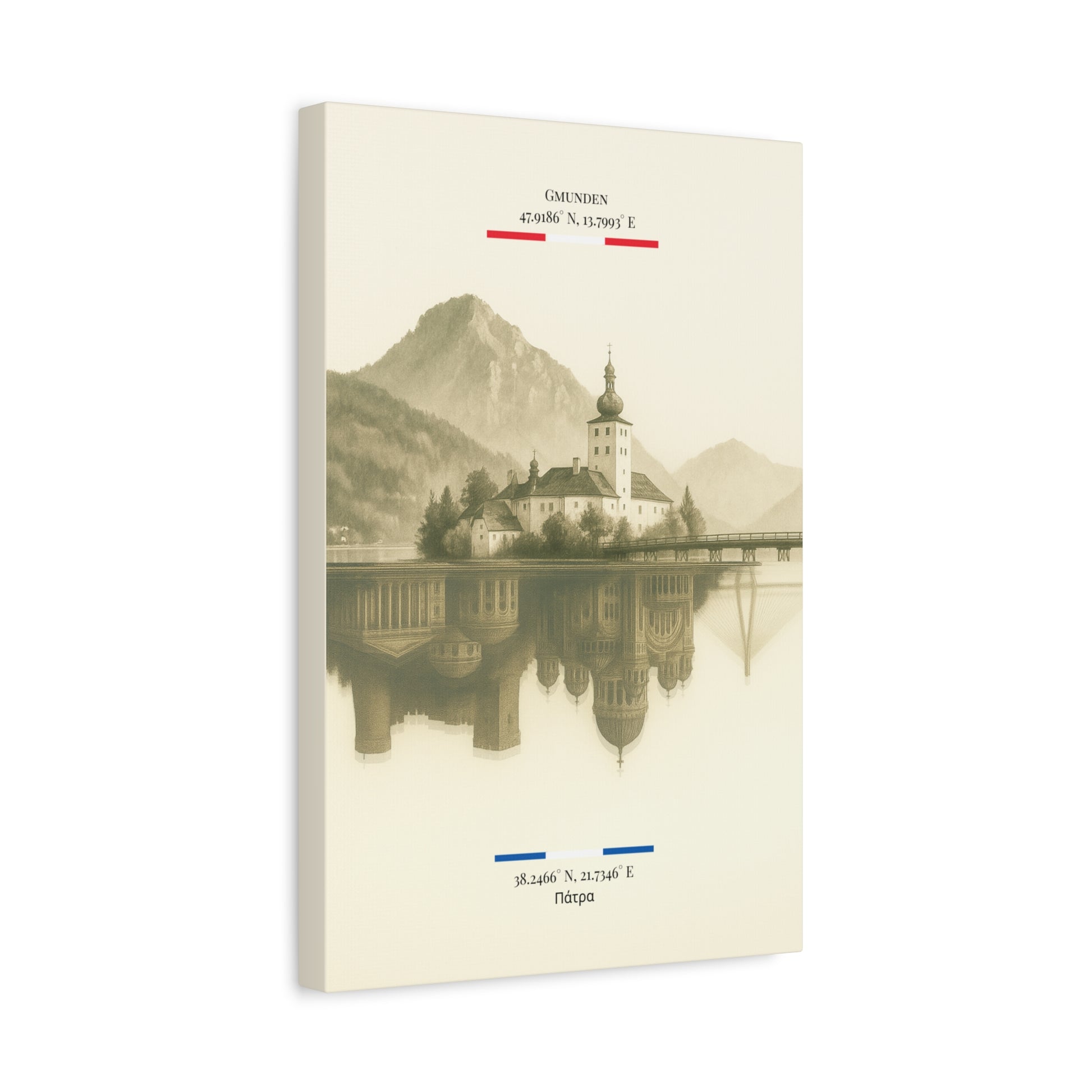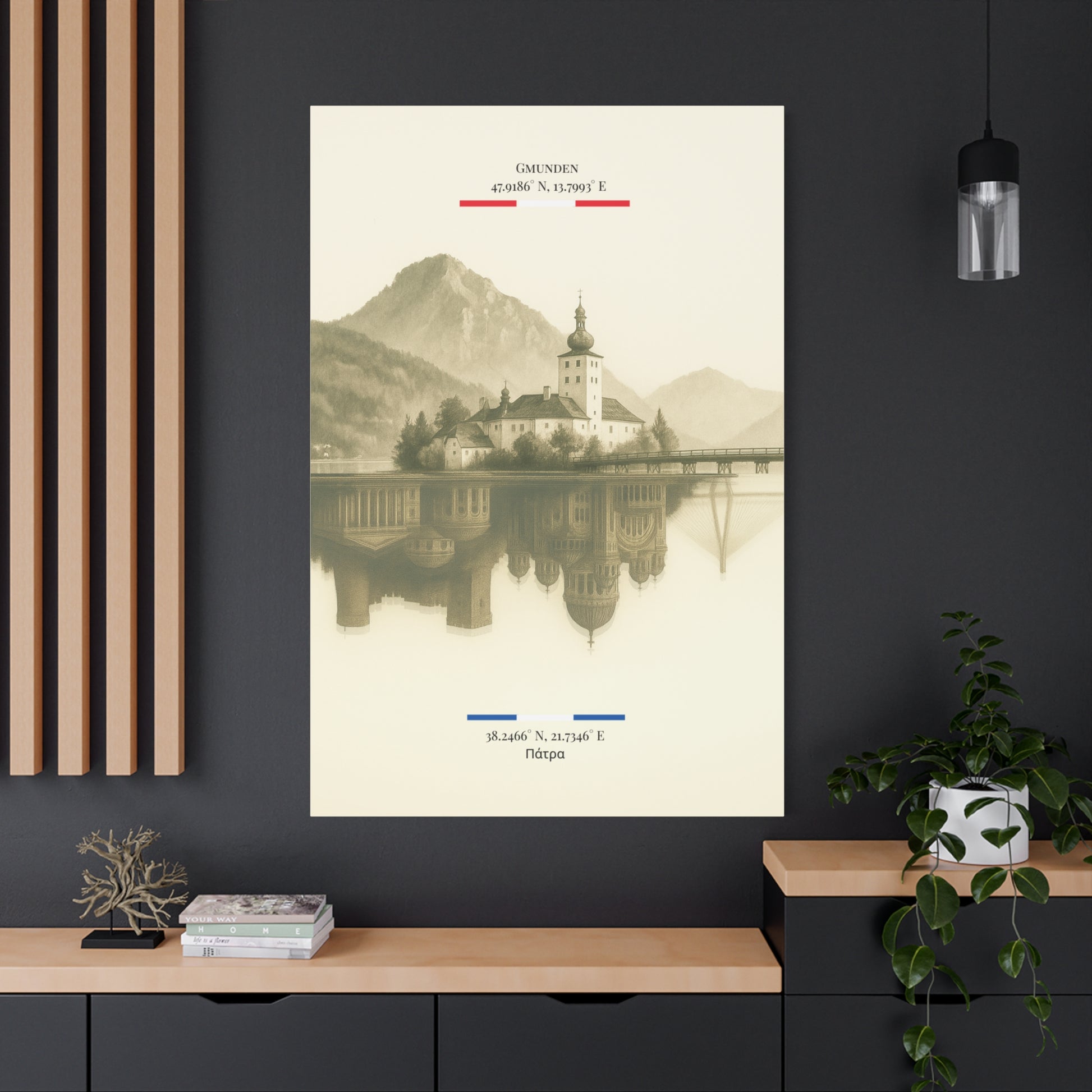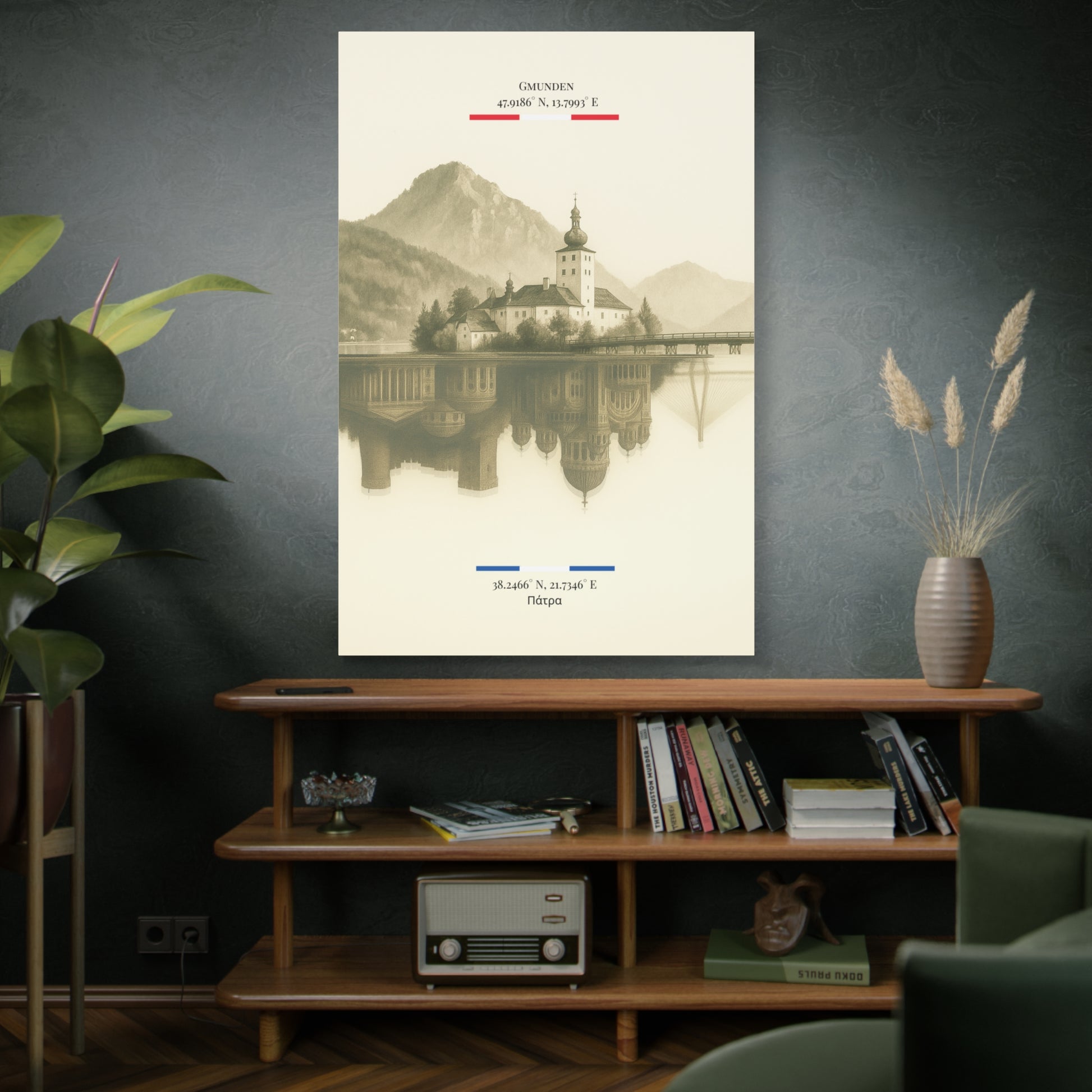 This fine-art illustration from our Weltenwanderer Collection captures the emotional path between Gmunden and Patras (Πάτρα / Patrai) — two cities shaped by water, mountains, and completely different rhythms of life. One calm and Alpine, the other sun-soaked and open to the Gulf of Corinth.